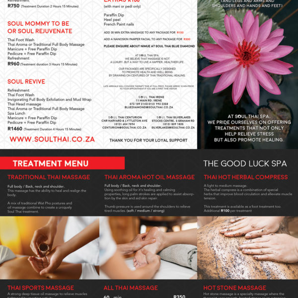 BUY A GIFT VOUCHERSoul Thai Gift Vouchers are the perfect gift. Valid for six months from date of purchase. Add to basket G5 Slimming Treatment PackageR1,750.00 R1,250.00 Add to basket Sinus MassageR280.00 R250.00 Add to basket R500 Gift VoucherR500.00R500 Gift Voucher for use on your choice of Treatments Add to basket R1000 Gift VoucherR1,000.00R1000 Gift Voucher for use on your choice of Treatments Add to basket Happy FeetR350.00Scrub, Mud Wrap and Foot Massage - Half Leg (60 Minutes) Add to basket Freshly ScrubbedR550.00Full Body Scrub and Thai Massage (90 Minutes) Add to basket Back Me UpR400.00Back Scrub and Back, Neck and Shoulder Massage (60…… Add to basket Couples 60 Minute Thai MassageR700.0060 Minute Traditional Thai Oil Massage Voucher Add to basket ADD CUPPINGR100.00Add Hot Stones Voucher Add to basket ADD HOT STONESR100.00Add Hot Stones Voucher Add to basket Couples 90 Minute Thai MassageR920.0090 Minute Couples Traditional Thai Oil Massage Voucher Add to basket ManicureR250.00Soul Thai Manicure Voucher Add to basket 30 Minute Thai Foot MassageR250.0030 Minute Thai Foot Massage Voucher Add to basket PedicureR300.00Soul Thai Pedicure Voucher Add to basket Full Body ScrubR350.00Thai Full Body Scrub and Head Massage Add to basket 60 Minute Thai MassageR350.0060 Minute Traditional Thai Oil Massage Voucher Add to basket 90 Minute Thai MassageR460.00 R440.0090 Minute Traditional Thai Oil Massage Voucher Add to basket 60 Minute Foot MassageR350.0060 Minute Thai Foot Massage Voucher Add to basket SOUL THAI Soul Rescue PackageR660.00SOUL THAI - Soul Rescue Package Voucher Add to basket SOUL THAI Pain & Stress Relief PackageR750.00SOUL THAI - Pain and Stress Relief Package Voucher Add to basket SOUL THAI Rejuvenate / Mommy to Be PackageR960.00SOUL THAI - Soul Mommy to Be Package Voucher Add to basket SOUL THAI Soul Revive PackageR1,460.00SOUL THAI - Soul Revive Package Voucher